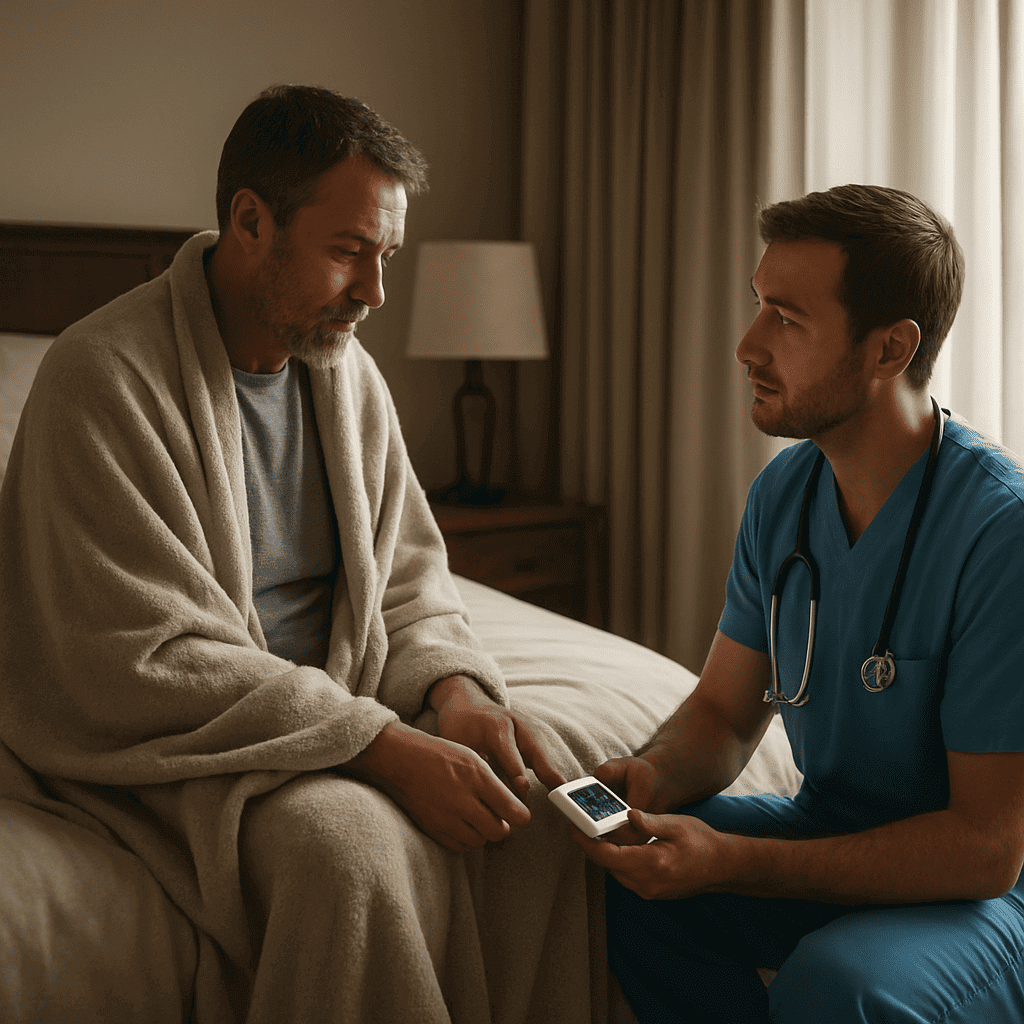 Breathing changes, confusion, chest pain, severe dehydration, or other danger signs trigger immediate clinical response. If home care is no longer safe, transfer to emergency care is coordinated without delay.